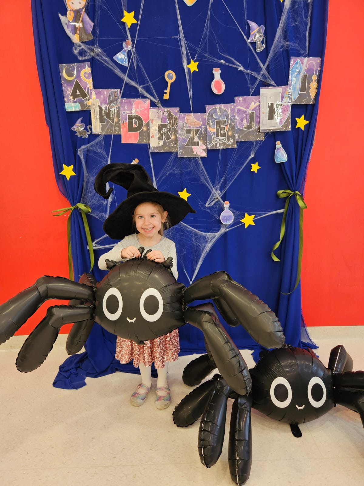 Dziewczynka w czarnym kapeluszu trzyma balon w kształcie pająka