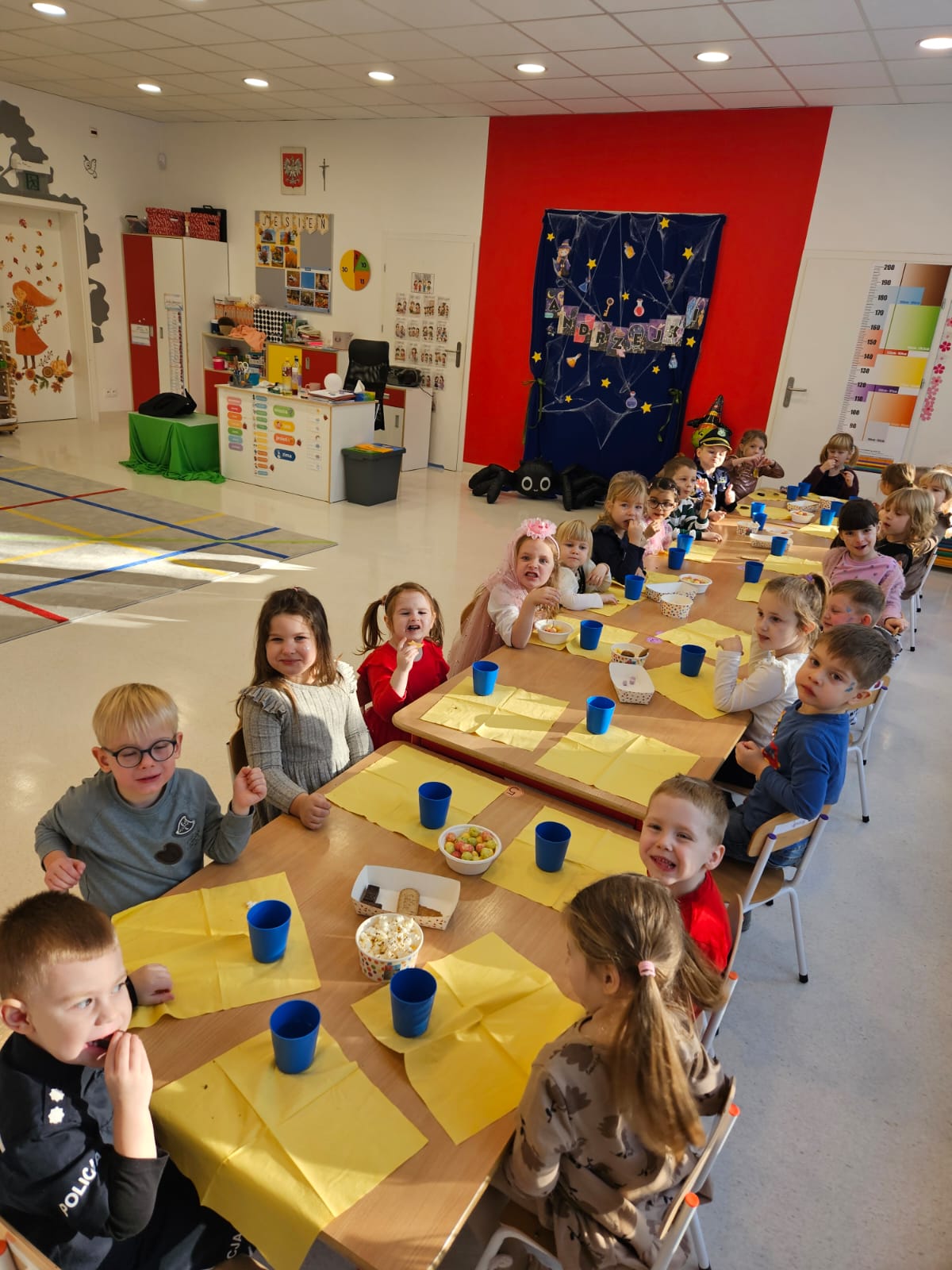 Dzieci siedzą za stołami w przedszkolu podczas posiłku