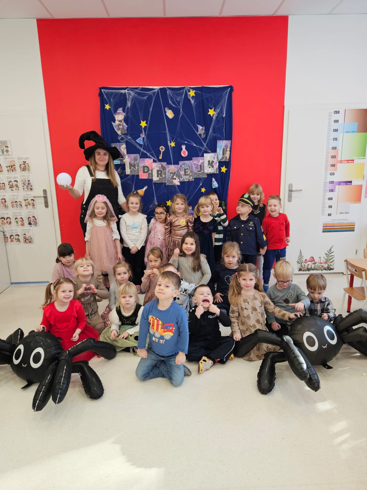 Grupa dzieci i nauczycielki w przebraniach na tle dekoracji
