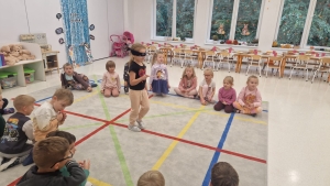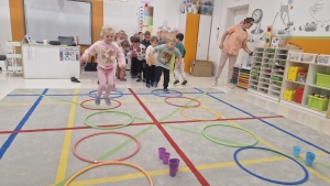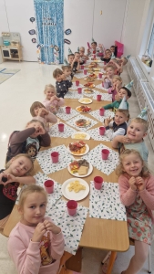 ruchowych i konkurencjach sprawnościowych. Taniec przy skocznej muzyce, sprawił wszystkim najwięcej radości. Zabawy zakończyliśmy wspólnym, słodkim poczęstunkiem. Dzień był pełen wrażeń, atrakcji, radości i dobrej zabawy.