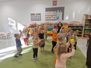 Każdy przedszkolak miał na sobie pomarańczowy element ubrania. Zajęcia rozpoczęły się od wprowadzenia dzieci do tematu poprzez dyniowe powitanie. Następnie rozpoczęła się główna część zajęć, podczas których dzieci poznały: różnorodność dyń, opisywały dynie, segregowały dynie pod względem wielkości, koloru, kształtu, wzbogacały swoją wiedzę na temat dyń. Przedszkolaki wzięły także udział w dyniowych zabawach ruchowych: slalom dyniowy, skoki przez dynie różnej wielkości, podawanie dyni w rzędzie rożnymi sposobami – nad głową, między nogami, czy z boku. Nie mogło zabraknąć zabawy z dynią przy muzyce .Na uwieńczenie tego wesołego dnia Żabki” wykonały przepiękną pracę plastyczną pt. „Dynia”.