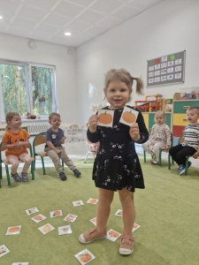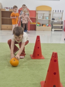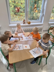 Każdy przedszkolak miał na sobie pomarańczowy element ubrania. Zajęcia rozpoczęły się od wprowadzenia dzieci do tematu poprzez dyniowe powitanie. Następnie rozpoczęła się główna część zajęć, podczas których dzieci poznały: różnorodność dyń, opisywały dynie, segregowały dynie pod względem wielkości, koloru, kształtu, wzbogacały swoją wiedzę na temat dyń. Przedszkolaki wzięły także udział w dyniowych zabawach ruchowych: slalom dyniowy, skoki przez dynie różnej wielkości, podawanie dyni w rzędzie rożnymi sposobami – nad głową, między nogami, czy z boku. Nie mogło zabraknąć zabawy z dynią przy muzyce .Na uwieńczenie tego wesołego dnia Żabki” wykonały przepiękną pracę plastyczną pt. „Dynia”.