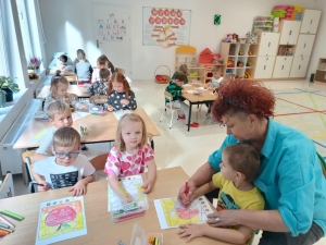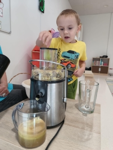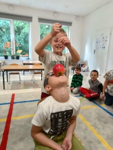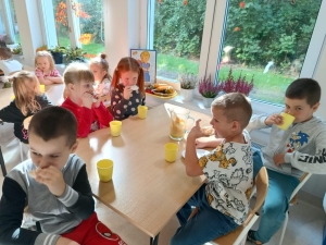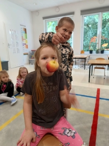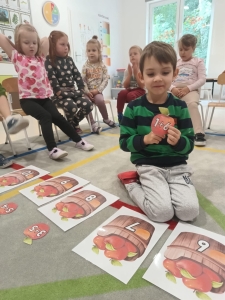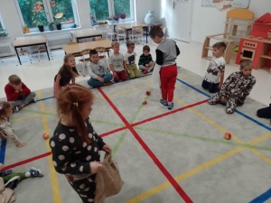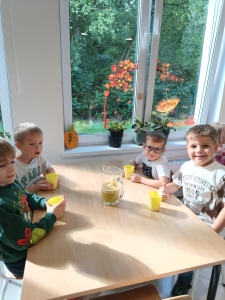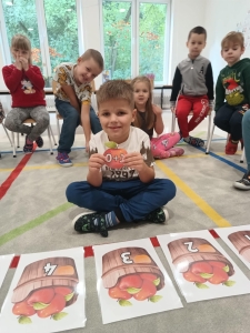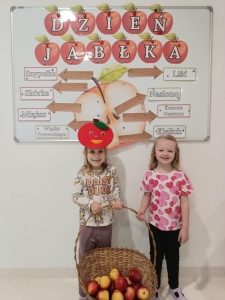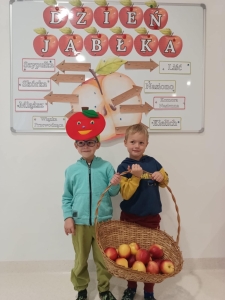 28 września obchodziliśmy w przedszkolu Dzień Jabłka. Celem zajęć i wspólnej zabawy była integracja wszystkich dzieci oraz zachęcanie ich do spożywania owoców, a w szczególności jabłek i to pod różnymi postaciami z powodu walorów zdrowotnych i odżywczych. To był bardzo ciekawy dzień w przedszkolu. Dzieci wszechstronnie poszerzały wiedzę o jabłku. Poznawały różne gatunki jabłek, rozpoznawały kształt, zapach, kolor, smak. Zdobywały wiadomości na temat potraw i przetworów z jabłek. Niesamowitą atrakcją było samodzielne wyciskanie przez dzieci jabłek i próbowanie świeżo zrobionego soku. Przedszkolaki rozwiązywały zagadki, uczestniczyły w konkursach grupowych, dowiedziały się również o tym jak rośnie jabłoń, zobaczyły na ilustracjach etapy rozwoju i budowy jabłka. Ponadto wykonały wiele zadań matematycznych a na koniec praca plastyczna z jabłkiem w roli głównej.