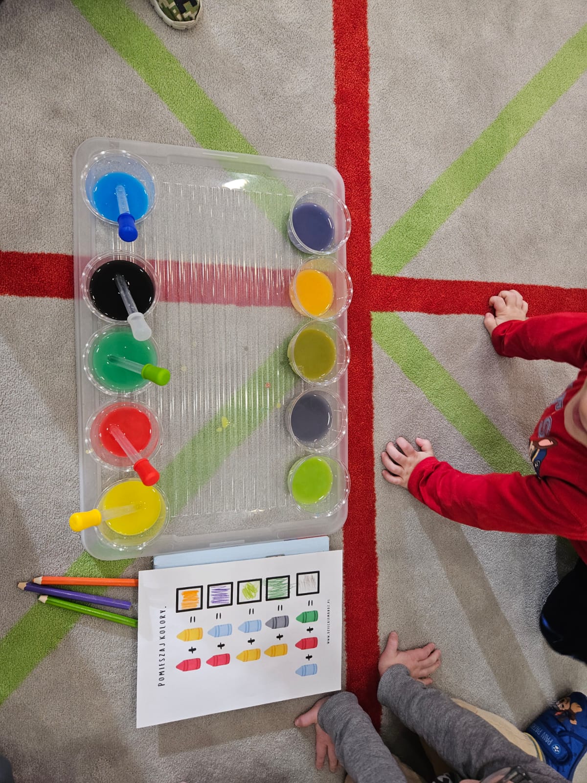 Dzieci siedzą na podłodze z zestawem do mieszania kolorów. (49 znaków)