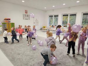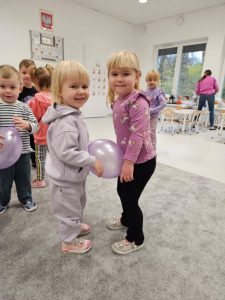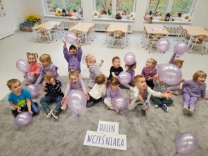 jak każdego roku, w dniu 17 listopada obchodzimy Światowy Dzień Wcześniaka. W tym dniu podejmowane są akcje mające na celu podniesienie świadomości na temat porodu przedwczesnego o problemów wcześniaków i ich rodzin na całym świecie. Symbolem dla tej akcji są mała, jak dla wcześniaka, fioletowa para skarpetek wiszących na sznurku obok większych skarpet noszonych przez noworodków. 18  listopada nasza grupa również wzięła udział w akcji. W przystępny dla naszych 3 i 4 latków sposób wytłumaczyliśmy, co to znaczy być wcześniakiem, pokolorowaliśmy skarpetki i pobawiliśmy się wspólnie balonami.