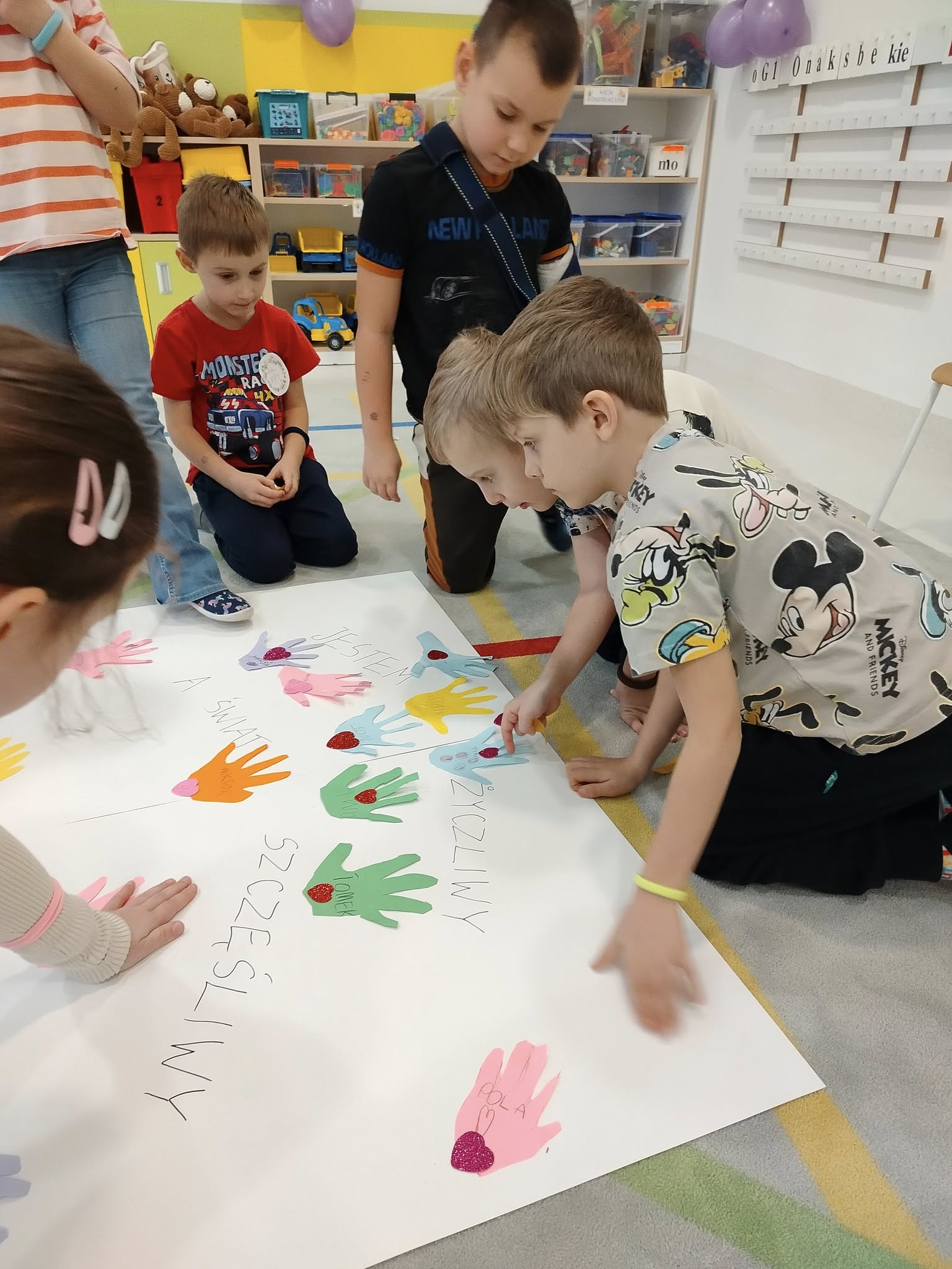 Dzieci w przedszkolu robią ręczne odciski na papierze