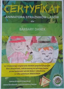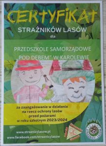 stworzenie ogólnopolskiej sieci Strażników Lasów poprzez edukowanie młodego społeczeństwa na temat ochrony lasów przed coraz częściej występującymi pożarami. Każdy uczestnik otrzymał niespodziankę w postaci Certyfikatu Małego Strażnika Lasów. Certyfikat otrzymał również opiekun grupy przedszkolnej Jeżyki oraz Przedszkole Samorządowe „Pod Dębem” w podziękowaniu za inicjowanie i wspieranie działań popularyzujących Eko – aktywność, nakierowaną na ochronę lasów przed pożarami.