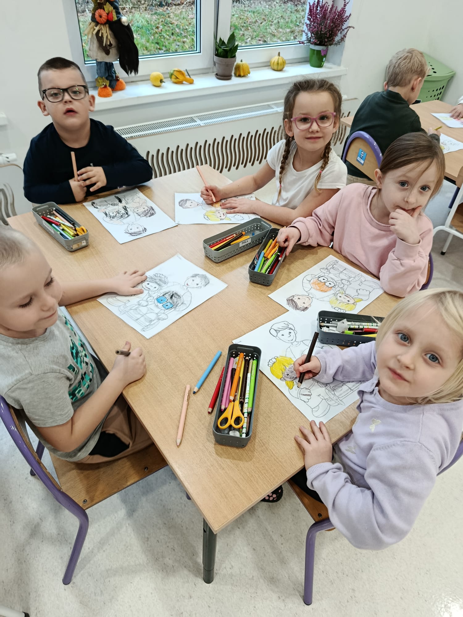 Dzieci siedzą przy stole i kolorują rysunki