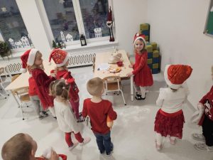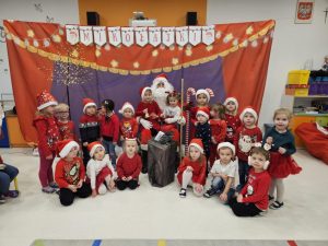 Zgodnie z tradycją 6 grudnia uroczyście obchodziliśmy w przedszkolu mikołajkowe święto.  W tym dniu wszyscy przyszli  w czerwonych strojach oraz  czapeczkach. Już od rana dzieci zastanawiały się, czy Mikołaj ich odwiedzi. Jak co roku Mikołaj nie zawiódł dzieci i przybył na czas – niezwykle wesoły, rozmowny i chętny do wspólnej zabawy. Spotkanie z nim przebiegało w bardzo radosnej i przyjaznej atmosferze. Przedszkolaki zaśpiewały Mikołajowi piosenkę. Święty Mikołaj obdarował dzieci wspaniałymi prezentami. Na ich twarzach malowała się wielka radość i przejęcie, a także nadzieja na kolejne spotkanie. Święty Mikołaju bardzo dziękujemy za odwiedziny i do zobaczenia za rok.