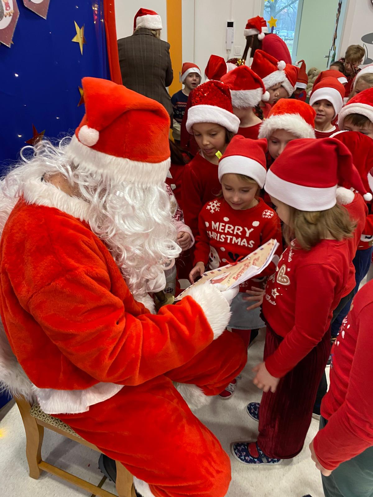 Mikołaj czyta książkę grupie dzieci w czerwonych czapkach