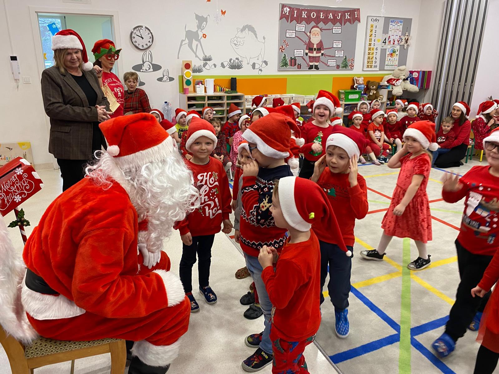 Dzieci w czerwonych czapkach i ubraniach spotykają się z Mikołajem w szkole