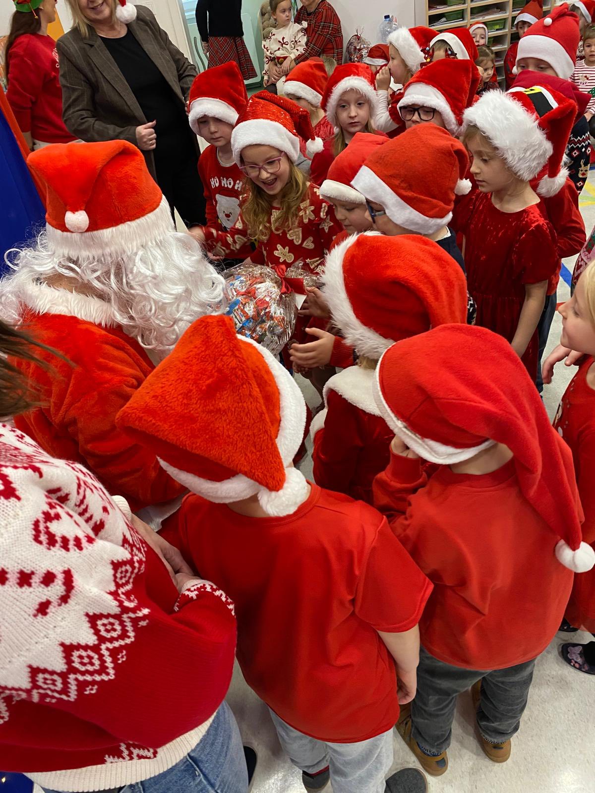 Grupa dzieci w czerwonych czapkach z Mikołajem