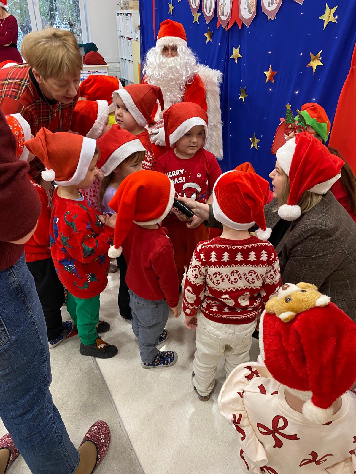 Dzieci w czapkach Mikołaja z Santa Clausem na tle
