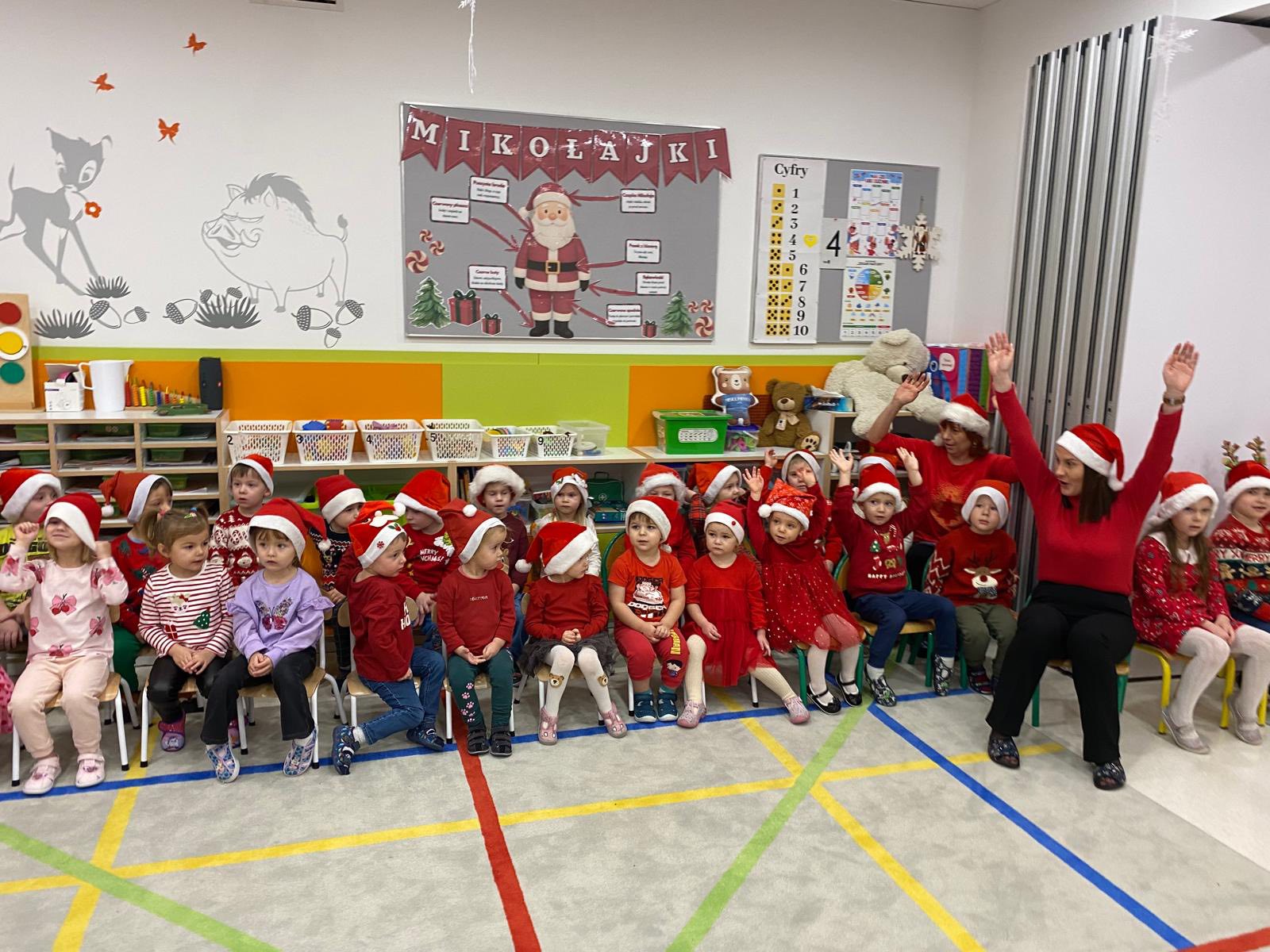 Grupa dzieci w czapkach Mikołaja z nauczycielką w klasie