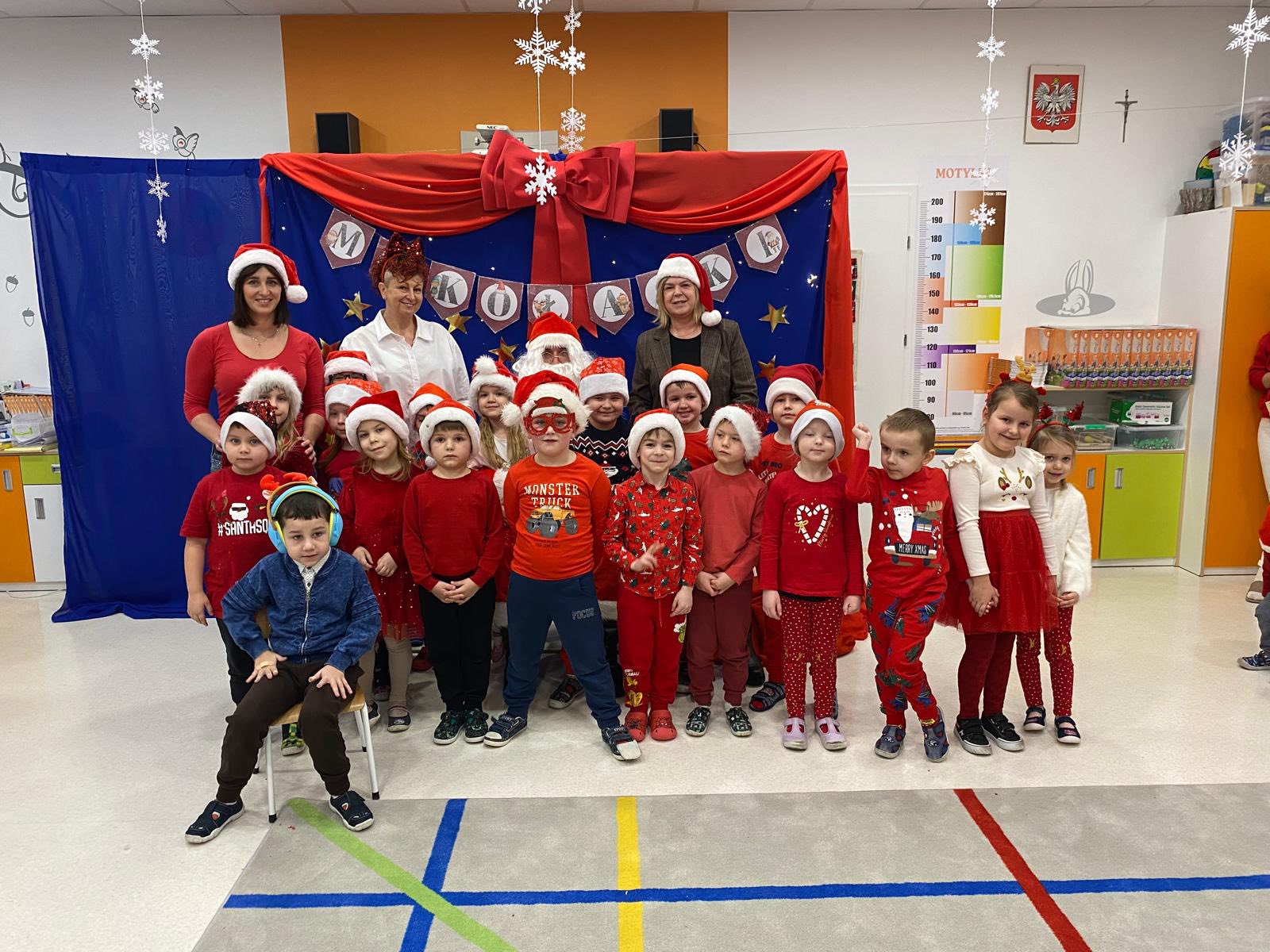 Grupa dzieci i dorosłych w mikołajkach i czapkach świątecznych