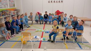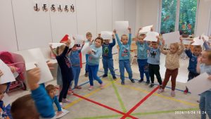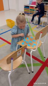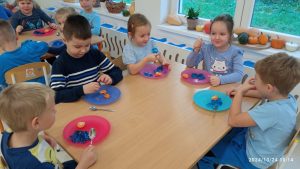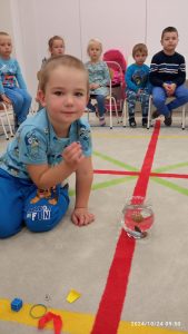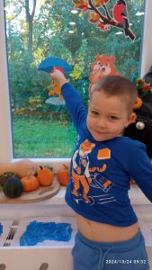 24.10.24r. w grupie Motylki obchodziliśmy „Niebieski dzień”. Wszystkie przedszkolaki przyszły ubrane na niebiesko. W trakcie zajęć rozpoznawaliśmy i szukaliśmy koloru niebieskiego i jego odcieni. Utrwaliliśmy wiedzę do czego człowiekowi potrzebna jest woda. Dowiedzieliśmy się w jaki sposób tworzą się (powstają) chmury. Zapoznaliśmy się z