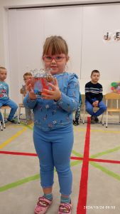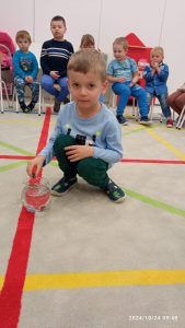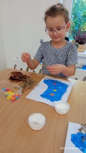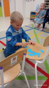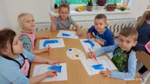 obiegiem wody w przyrodzie. Rozpoznawaliśmy przedmioty za pomocą zmysłu dotyku. W trakcie eksperymentu dowiedzieliśmy się jakie przedmioty unoszą się na wodzie, a które toną. Próbowaliśmy przenosić słomką kropelki deszczu. Integrowaliśmy się w wielu zabawach ruchowych i tanecznych. Współpracowaliśmy w grupie. Wykonaliśmy także pracę plastyczną: „Kalosze”. Na koniec zjedliśmy pyszną, niebieską galaretkę. To był bardzo ciekawy dzień.