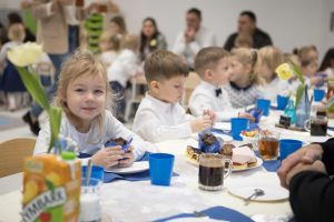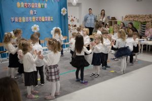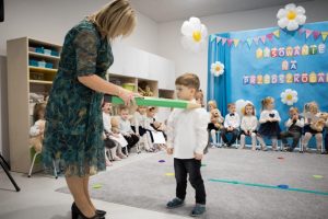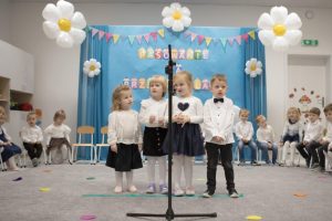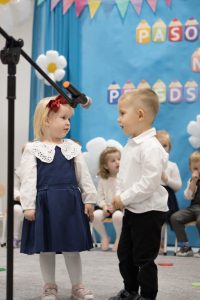 Dzieci z tej okazji przygotowały program artystyczny, w którym zaprezentowały swoje umiejętności, dając tym samym dowód, jak dużo już potrafią. Były więc wierszyki, piosenki i tańce. Po części artystycznej dzieci obiecały: zgodnie bawić się w przedszkolu, przychodzić każdego dnia z uśmiechem, słuchać pani, pomagać kolegom i być dzielnym przedszkolakiem. Po złożonej obietnicy Pani Dyrektor dokonała uroczystego pasowania każdego dziecka na przedszkolaka. Na pamiątkę tego ważnego wydarzenia każdy przedszkolak otrzymał pluszowego misia oraz dyplom pasowania. Po występach przyszedł czas na słodki poczęstunek.