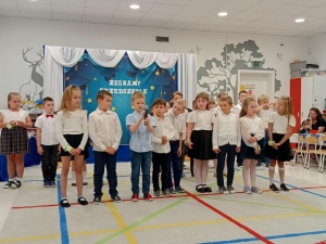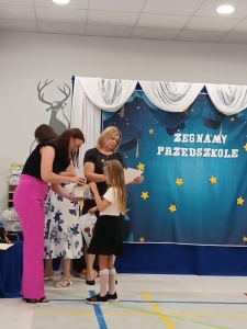 Przedszkolaki wspólnie z wychowawcą przygotowały pożegnalny program artystyczny. Absolwenci przejęci i rozumiejący powagę sytuacji pięknie recytowały wiersze i śpiewały piosenki. Wzruszenie udzieliło się wszystkim obecnym. Po części artystycznej Pani Dyrektor wręczyła dyplomy i podziękowania rodzicom zaangażowanym w działania na rzecz naszej placówki. Dzieci otrzymały prezenty w postaci pamiątkowych dyplomów ukończenia przedszkola oraz słodkości i drobne upominki.