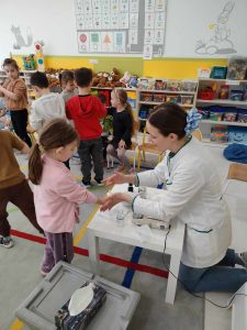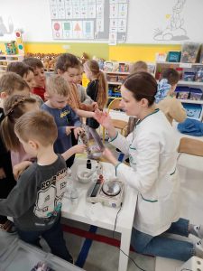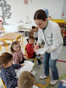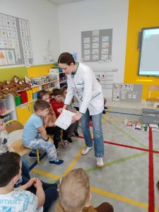 10 kwietnia w ramach projektu „Poznajemy zawody rodziców” gościliśmy Panią Magdę – mamę Tadka i Leona. Pani Magda zapoznała dzieci z zawodem technik farmacji. Opowiedziała nam o swoim dniu pracy i wykonała razem z dziećmi bezpieczną maść. Na koniec mama Tadka i Leona podarowała upominki dla dzieci. Było to bardzo ciekawe i pełne wiedzy spotkanie. Dziękujemy za przybycie.