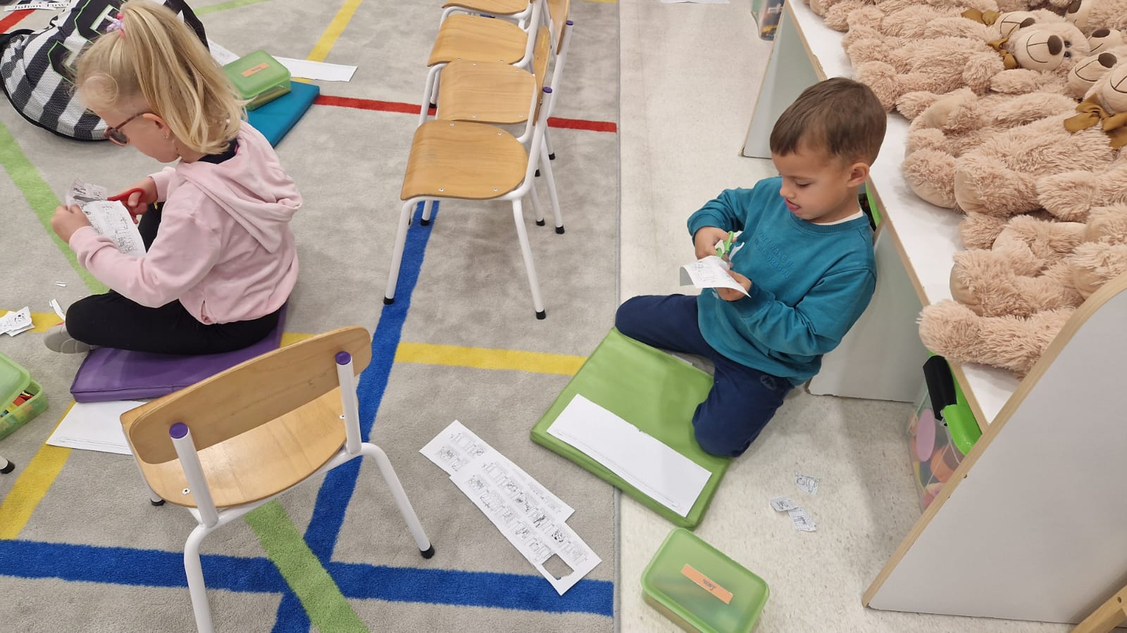 Dwie dzieci siedzą na podłodze w klasie i rysują
