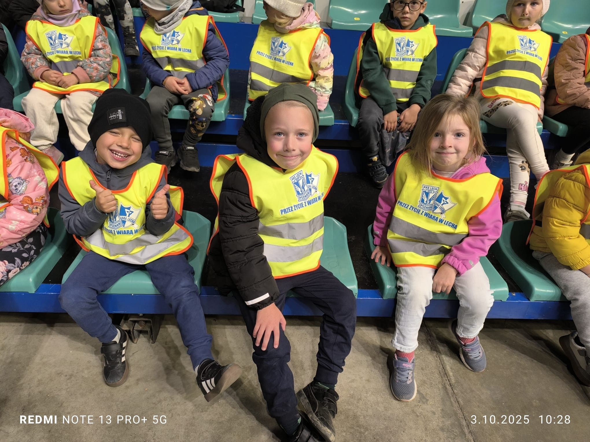 Dzieci w żółtych kamizelkach siedzą na trybunach stadionu
