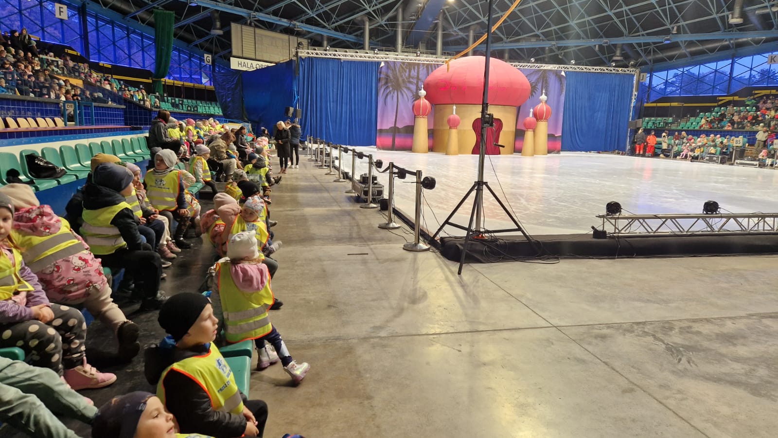 Dzieci w żółtych kamizelkach siedzą w hali widowiskowej