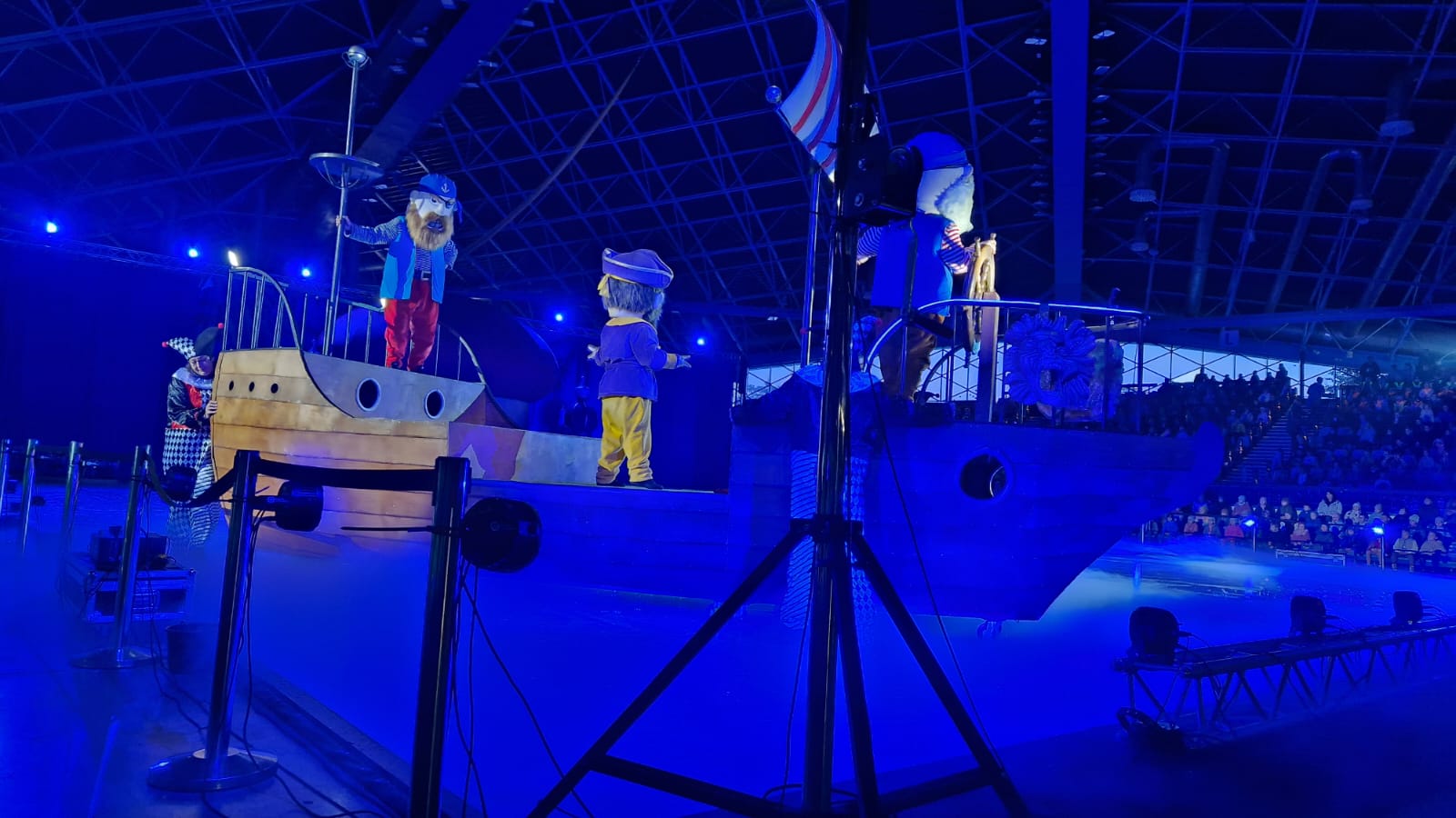 Scena z postaciami w kostiumach na statkach podczas przedstawienia