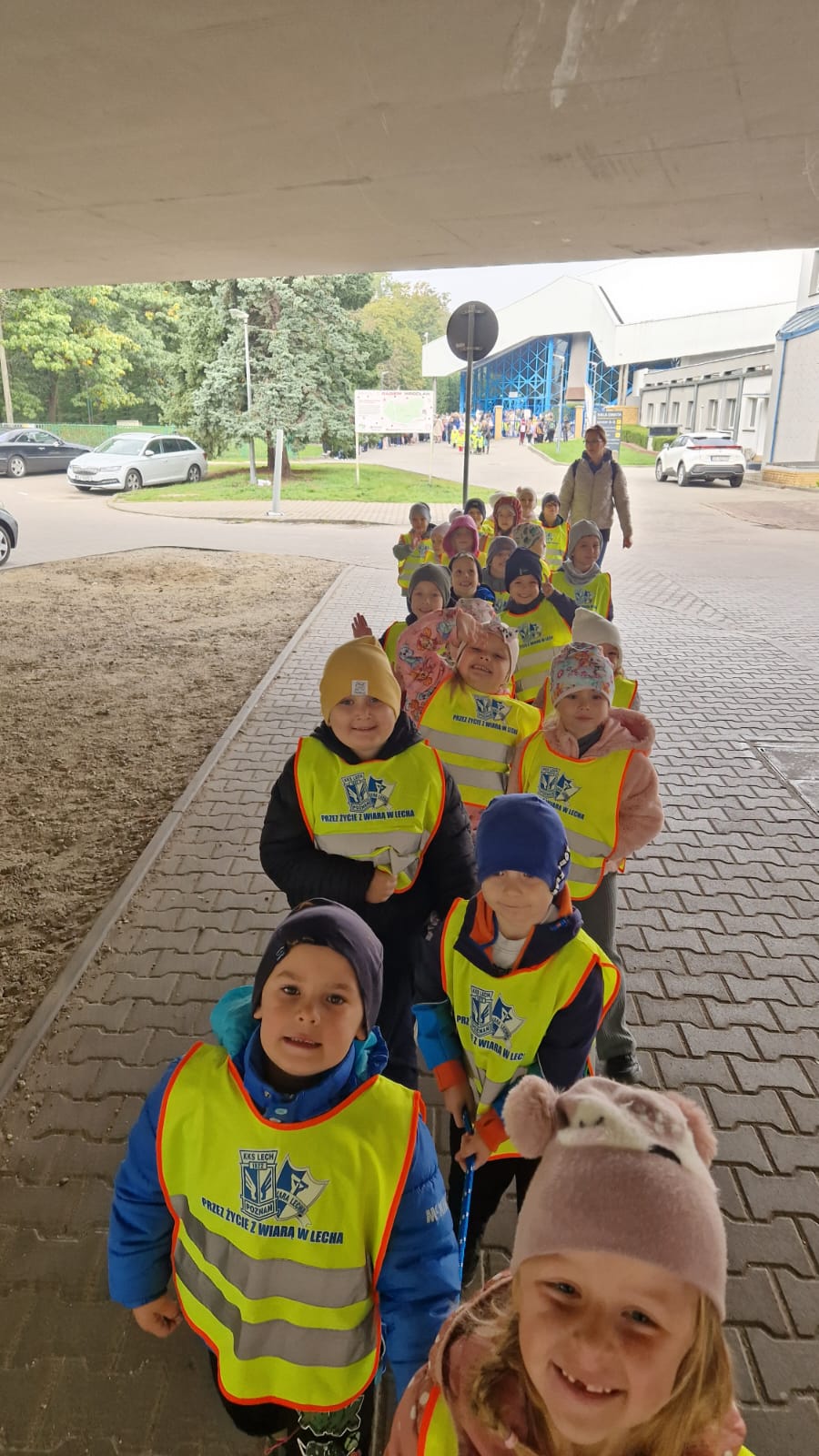 Grupa dzieci w żółtych kamizelkach podczas spaceru na ulicy