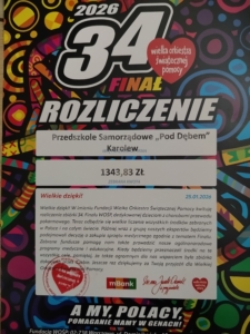 Serdecznie dziękujemy dzieciom, rodzicom i dziadkom oraz pracownikom przedszkola za wsparcie ogólnopolskiej akcji Wielkiej Orkiestry Świątecznej Pomocy. Dziękujemy za dobre serce.