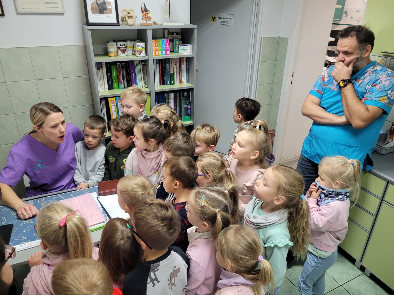 Grupa dzieci w przedszkolu słucha opowieści od dwóch dorosłych