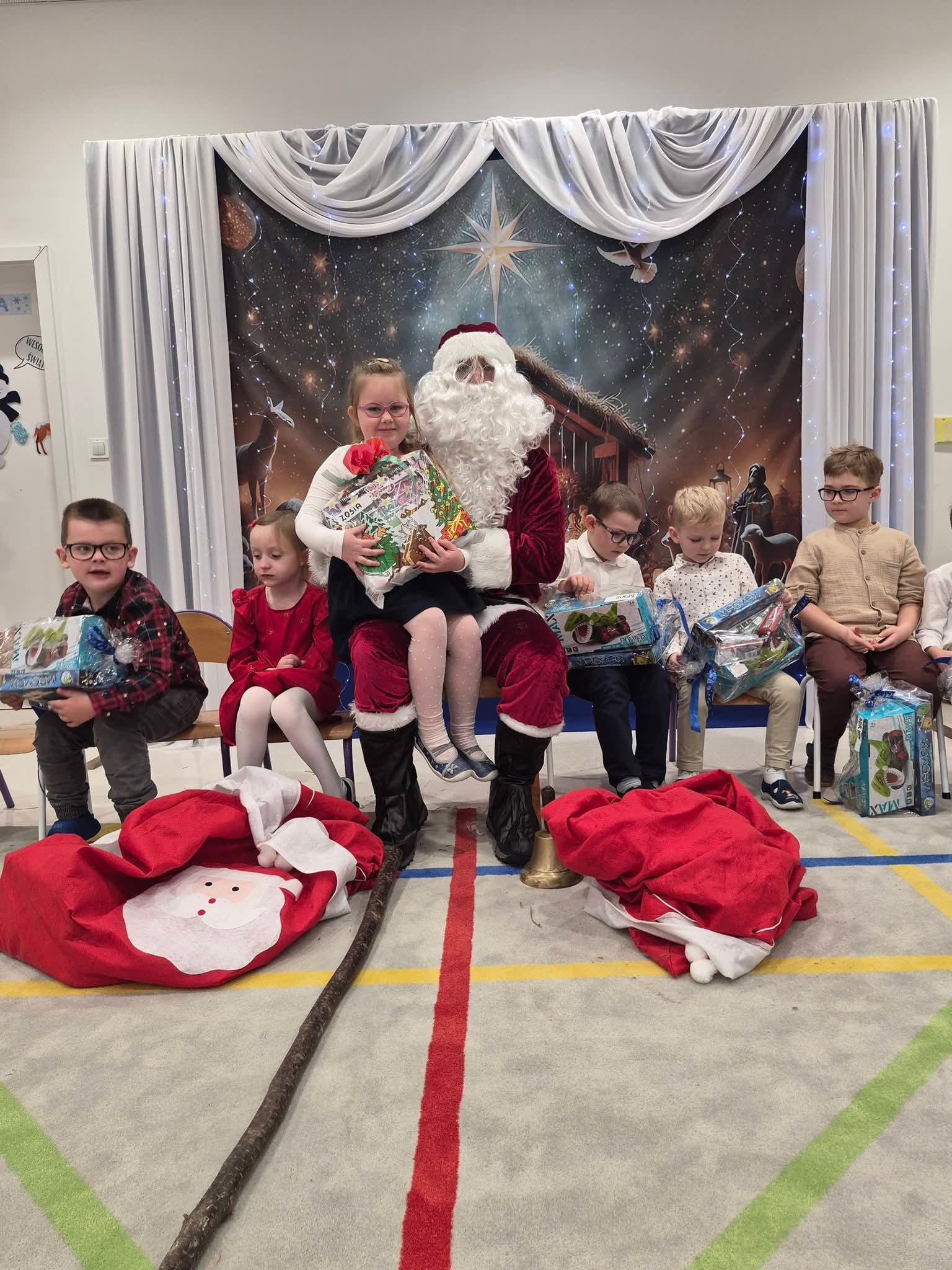 Dzieci siedzą z Mikołajem, który wręcza prezenty. Na podłodze leży worki