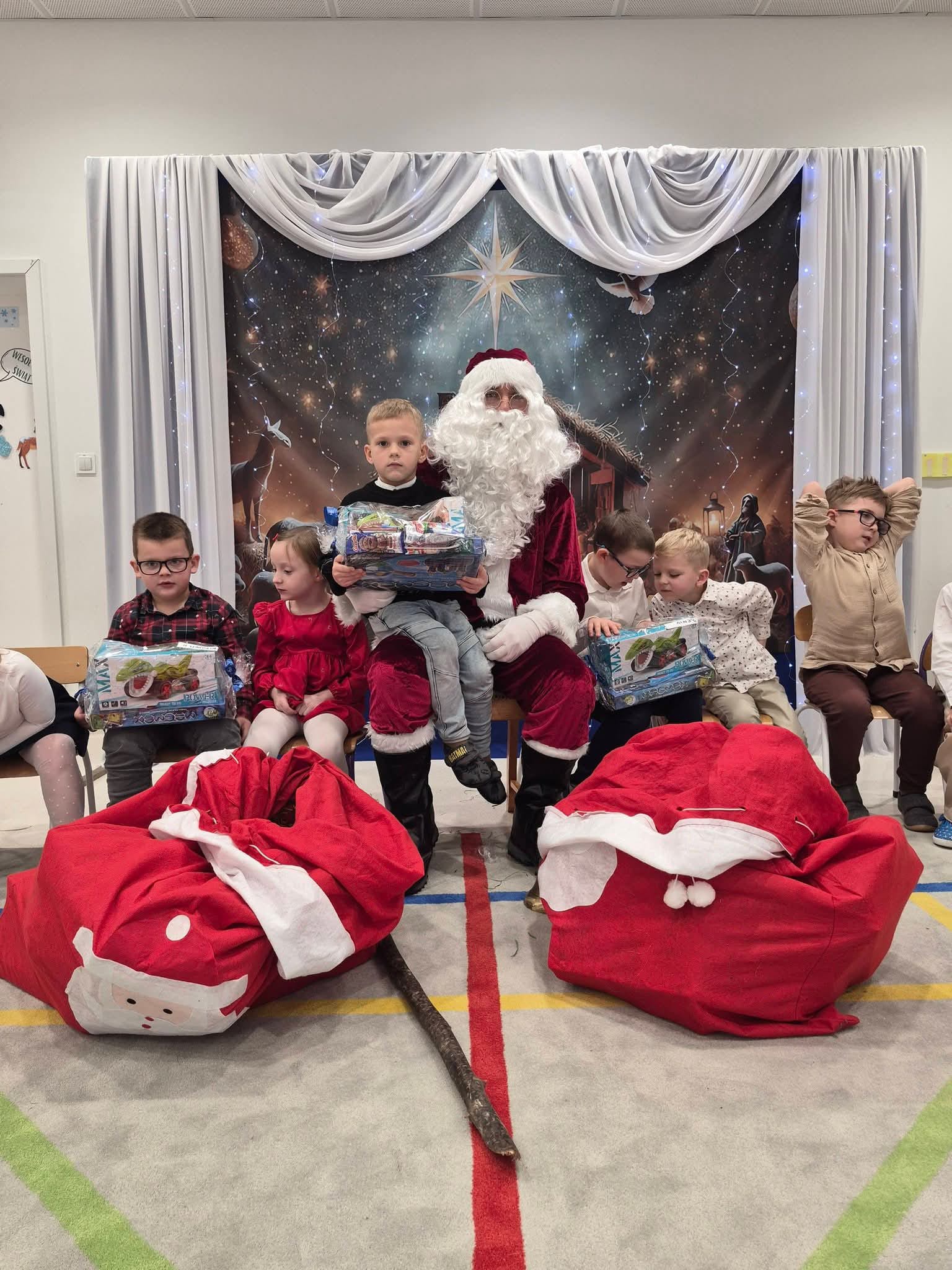 Dzieci siedzą z Mikołajem, trzymając prezenty. Na podłodze leżą worki