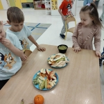 16 października dzieci z grupy „Pszczółki” w ramach realizacji Ogólnopolskiego Projektu Edukacyjnego „Kreatywne Dni Nietypowe” brały udział w zajęciach z okazji Światowego Dnia Owoców i Warzyw. Przedszkolaki nazywały przyniesione przez siebie owoce i warzywa, dzielili na grupy, rozpoznawały po dotyku, wykonywały zadania na tablicy multimedialnej oraz świetnie bawiły się do piosenki „Gimnastyka z warzywami”. Na podsumowanie wykonały pracę plastyczną „Talerz pełen witamin”. Nie zabrakło także kosztowania przyniesionych warzyw i owoców. Był to dzień warzywno – owocowy.