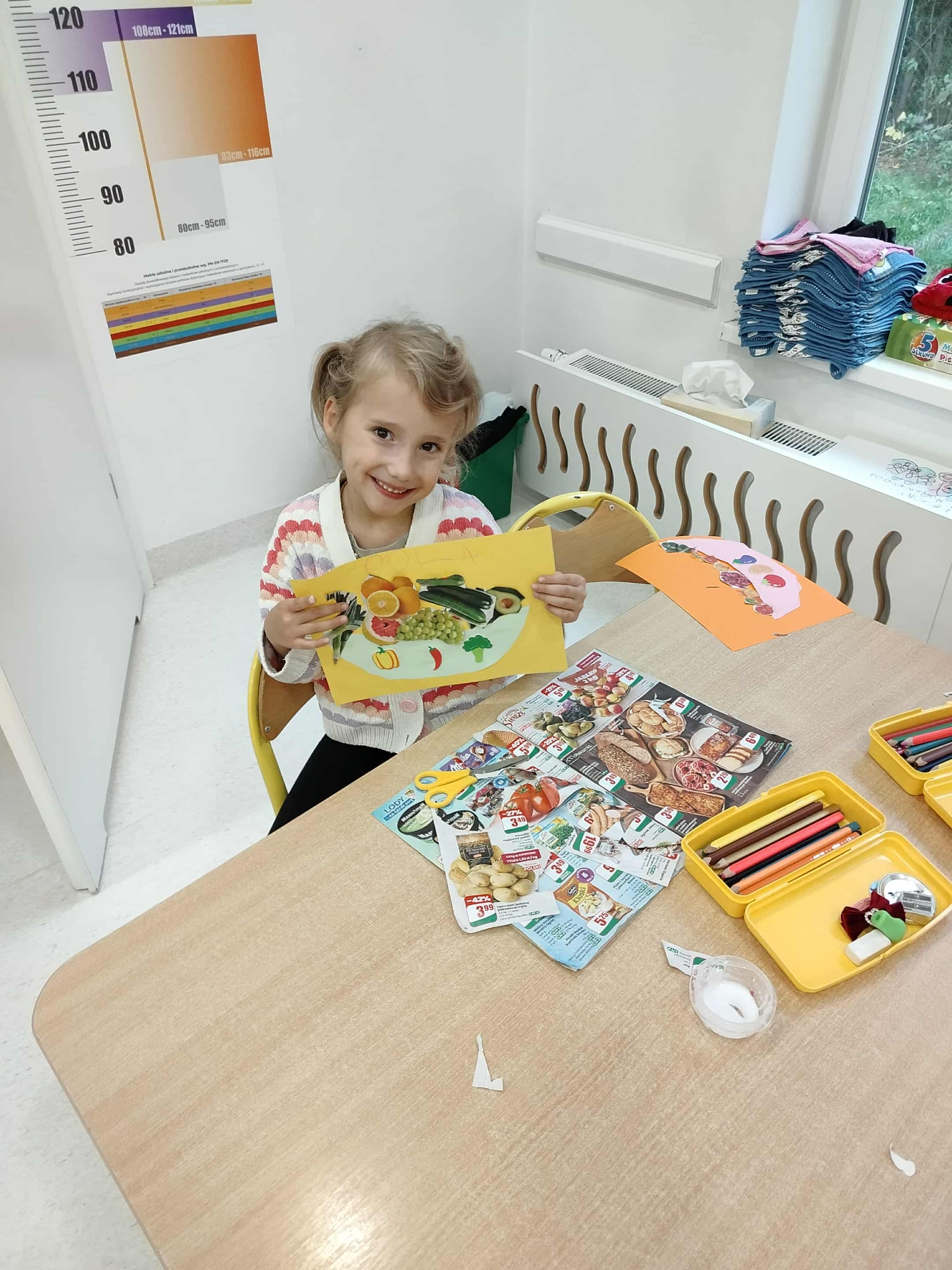 Dziewczynka siedzi przy stole i trzyma kolorowy rysunek z owocami