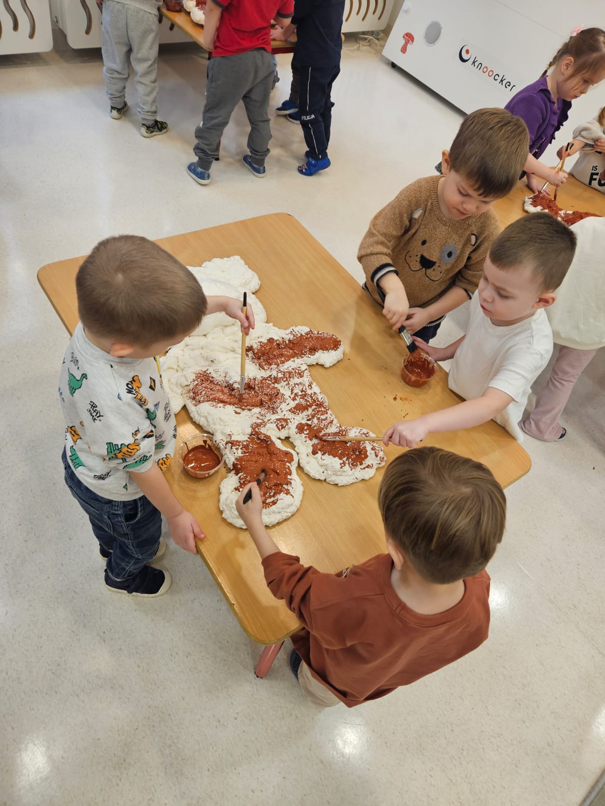 Dzieci przygotowują pizzę na stole w przedszkolu