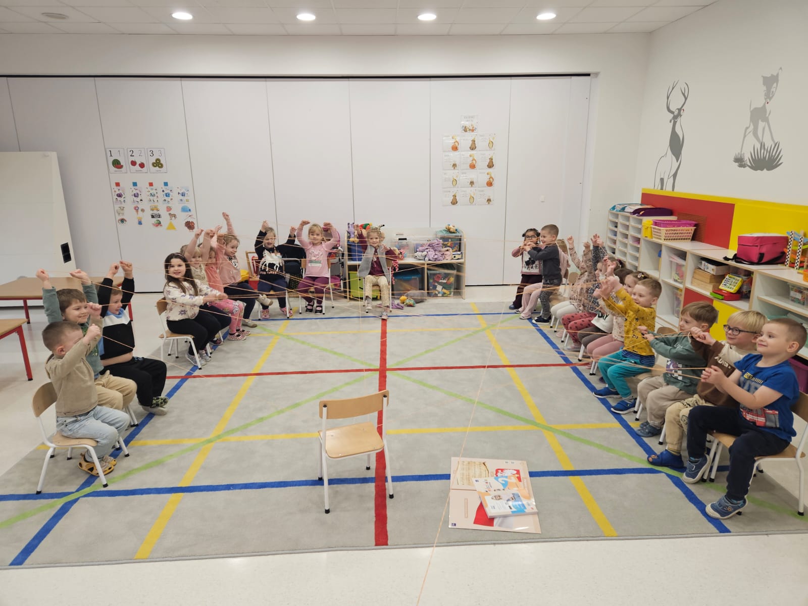 Dzieci siedzą na krzesłach w sali lekcyjnej, ucząc się gry