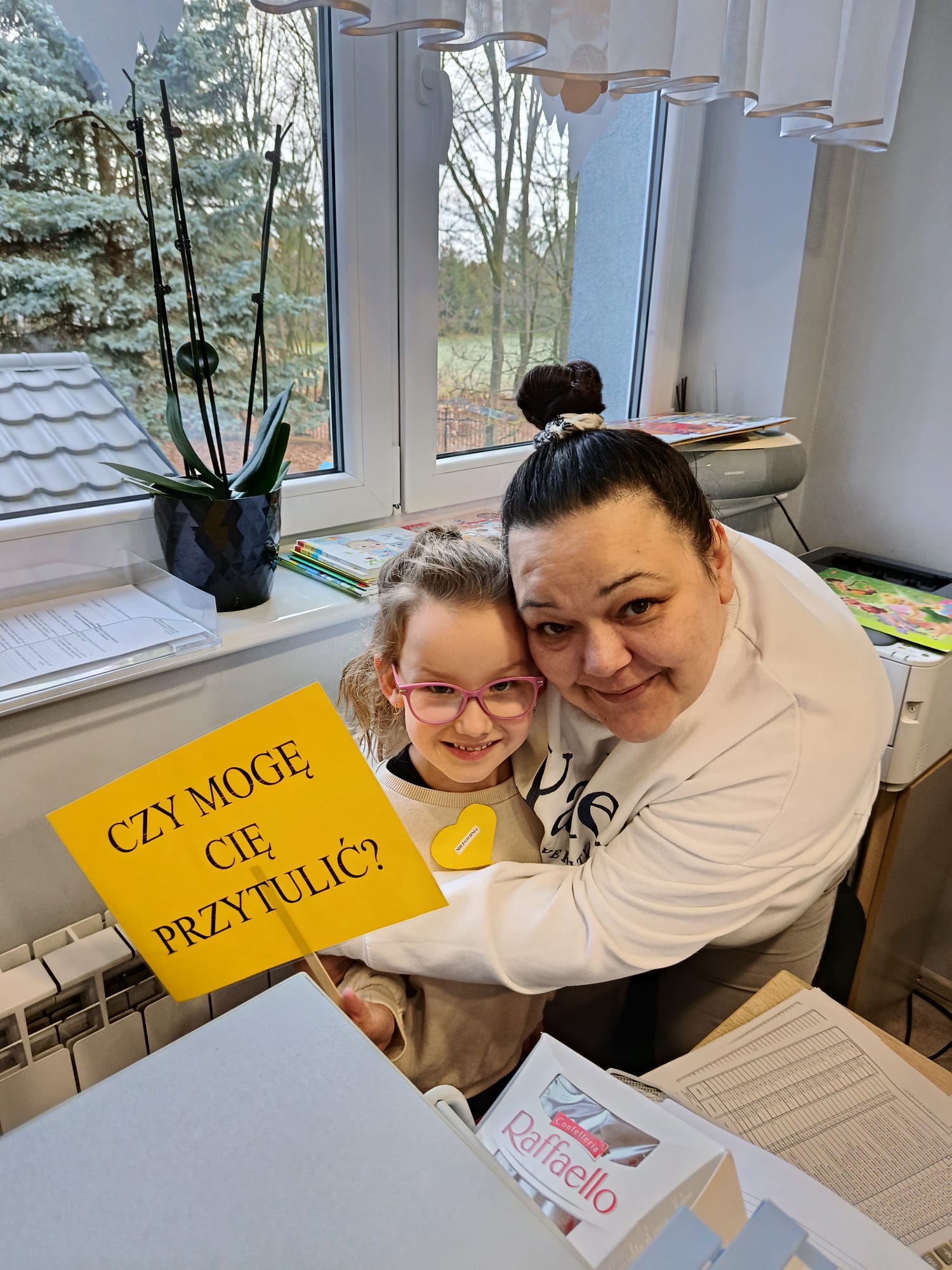 Kobieta i dziewczynka trzymają żółty plakat z napisem "Czy mogę cię przytulić?"