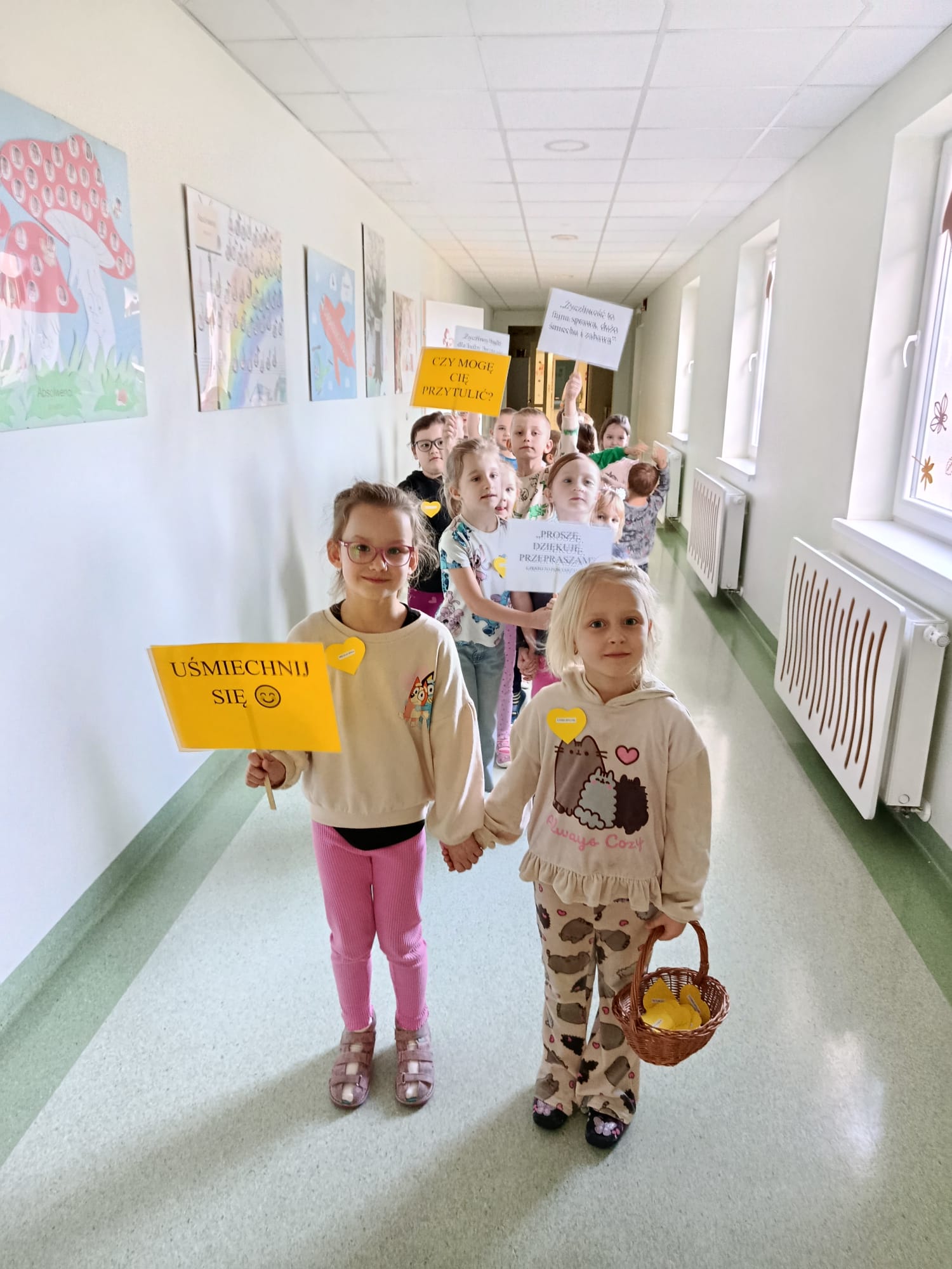 Dzieci w szkolnym korytarzu trzymają plakaty z napisami