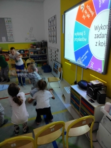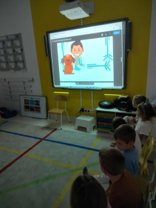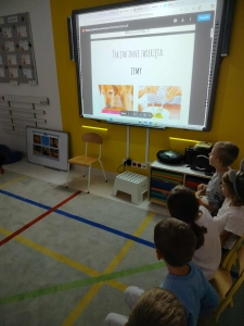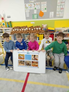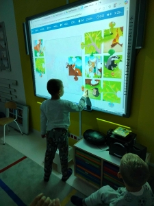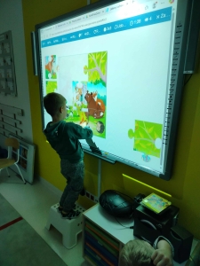 2 października w ramach akcji „Tydzień budowania relacji” zrealizowaliśmy temat „Co zwierzęta robią jesienią ?” z wykorzystaniem tablicy multimedialnej. Dzieci obejrzały bajkę na podstawie, której dowiedziały się jak można pomagać zwierzętom. Odbyła się także pogadanka z dziećmi o szacunku i empatii wobec zwierząt, na podstawie ilustracji przedstawiających prawa zwierząt. Tablicę wykorzystaliśmy także do zabaw ruchowych oraz do układania puzzli online ze zwierzętami.