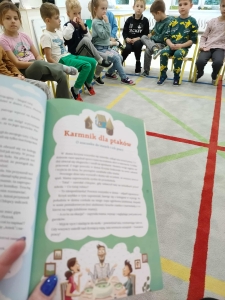 Po obiedzie w ramach popołudniowego czytania, dzieci wysłuchały bajki terapeutycznej „Karmnik dla ptaków”. Przedszkolaki dowiedziały się, że szacunek należy się nie tylko zwierzętom, ale także innym ludziom i ich pracy, niezależnie jaki zawód wykonują.