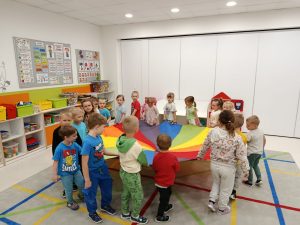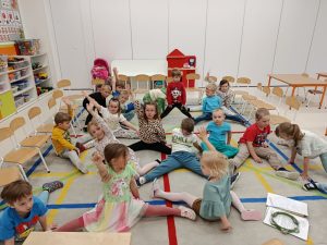 Tańczyliśmy z chustą animacyjną do piosenki: „Tęcza, tęcza, cza cza cza…” Na koniec wykonaliśmy pracę plastyczną: „Tęcza”. „Tęczowy dzień”, był także podsumowaniem naszych całorocznych działań związanych z innowacją: „Kolorowe dni, kolorowy świat”. Dzieci mogły w każdym miesiącu utrwalić i bawić się innym kolorem. Dziękuję Motylkom za aktywny udział w zajęciach, a rodzicom za wsparcie i zaangażowanie w sytuacjach, kiedy