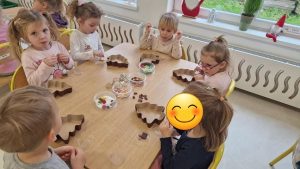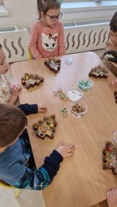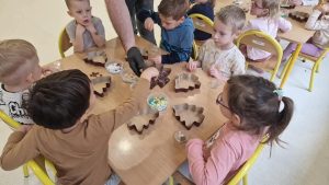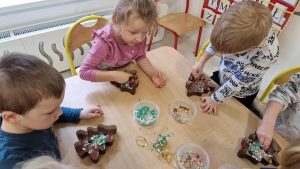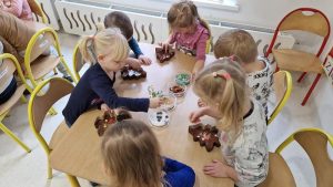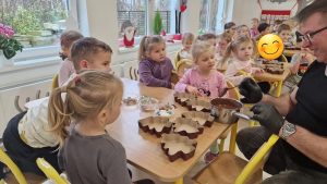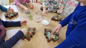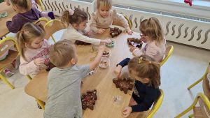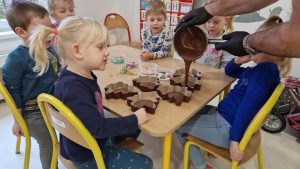 W ramach warsztatów czekoladowych dzieci zapoznały się z historią czekolady, zobaczyły prawdziwy owoc kakaowca oraz skosztowały jego zdrowych ziaren. Następnie uczestnicy warsztatów i spróbowali belgijskiej czekolady Callebaut w formie kaletek. Korzystając z różnorodnych dodatków: bakalii, posypek, kolorowych drażetek czy pianek dzieci samodzielnie wykonały choinki czekoladowe i ozdobiły je według własnego uznania. Podczas warsztatów unosił się zapach czekolady, a dzieciom towarzyszył wspaniały humor.