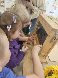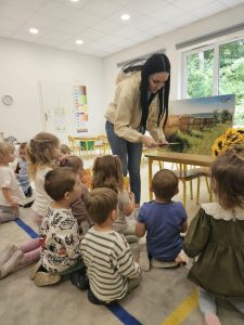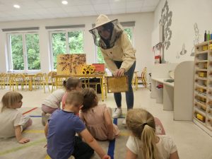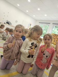 22 maja nasze przedszkole odwiedził wyjątkowy gość – Pani pszczelarz, która przeprowadziła dla dzieci fascynujące warsztaty pszczelarskie. Przedszkolaki miały okazję z bliska zobaczyć strój pszczelarza oraz prawdziwy ul (bez pszczół), a także dowiedzieć się, jak powstaje miód i jak wygląda życie pszczół w ulu. Pszczół nie było w ulu, ale mogliśmy zobaczyć prawdziwy rój w przeszklonym mini ulu. Dzieci z zainteresowaniem słuchały opowieści o pracy pszczelarza, oglądały ramki z plastrami wosku. Na zakończenie każdy uczestnik wykonał własną świeczkę z wosku pszczelego, którą zabrał do domu. Warsztaty były nie tylko bardzo ciekawe, ale również pełne zapachów i nowych doświadczeń – to był prawdziwie miodowy dzień!
