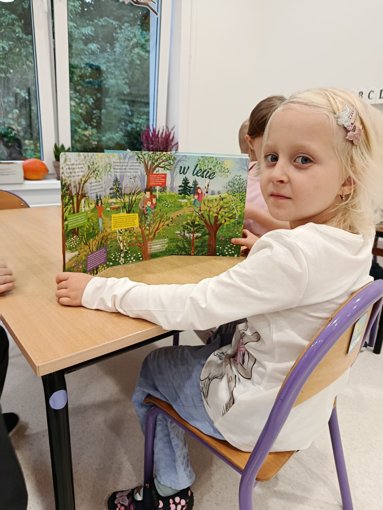 Dziewczynka siedzi przy stole i trzyma otwartą książkę
