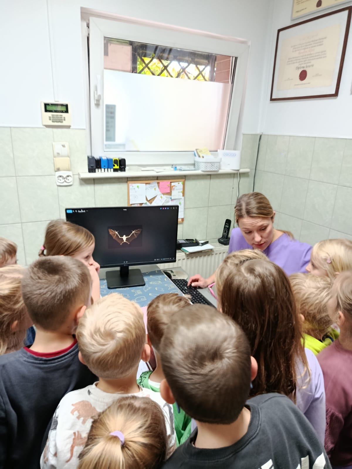 Grupa dzieci obserwuje komputer z nauczycielką w szkolnym pomieszczeniu