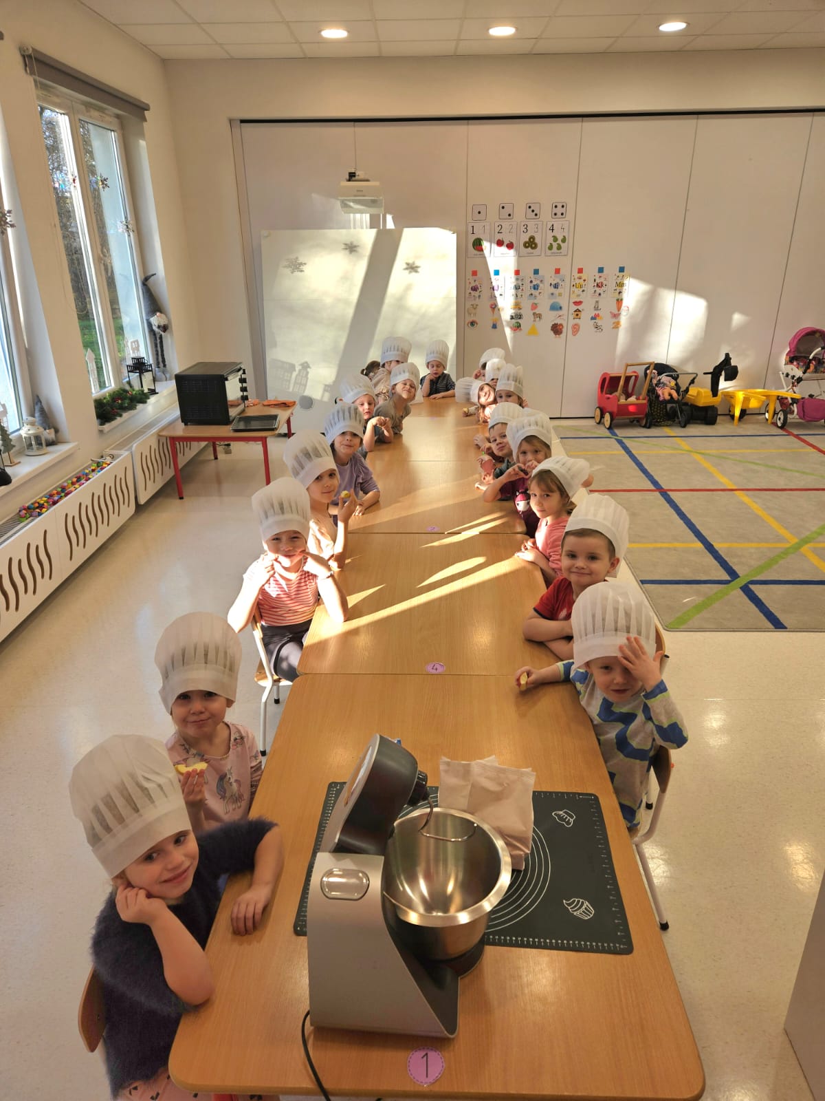 Dzieci w czapkach kuchennych siedzą przy długim stole w przedszkolu