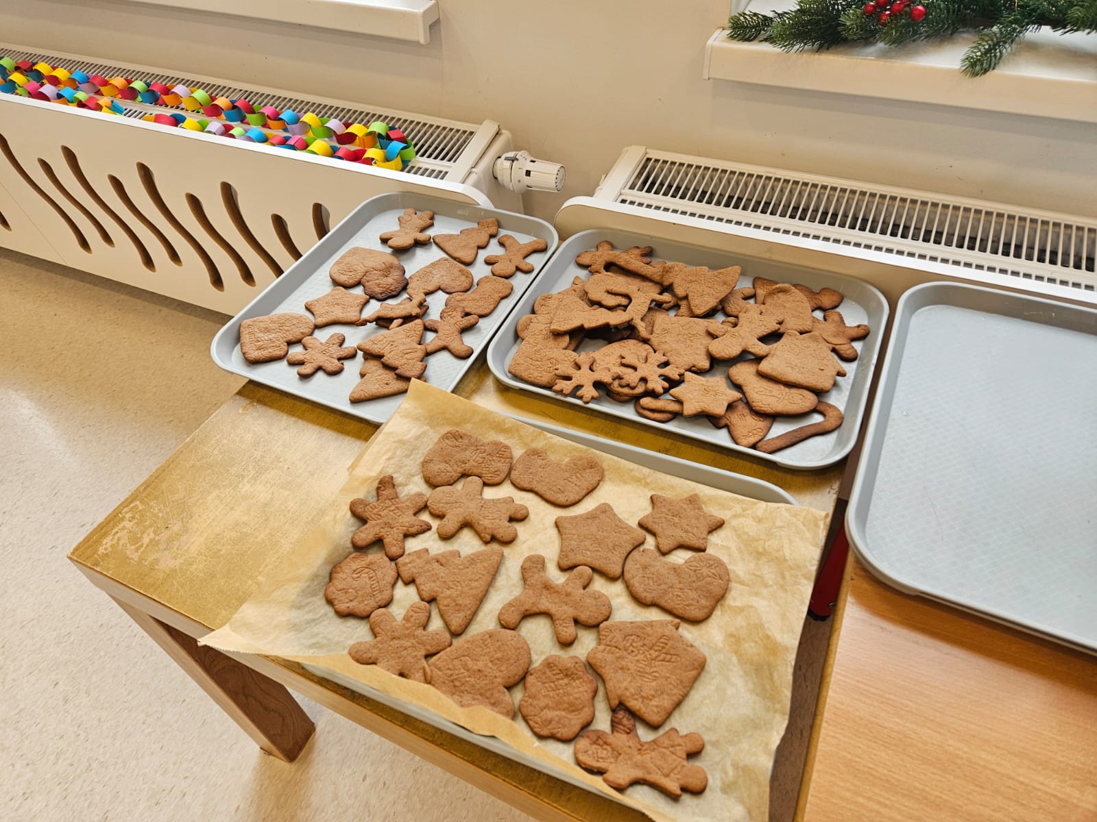 Pierniki w różnych kształtach na blachach do pieczenia. (45 znaków)