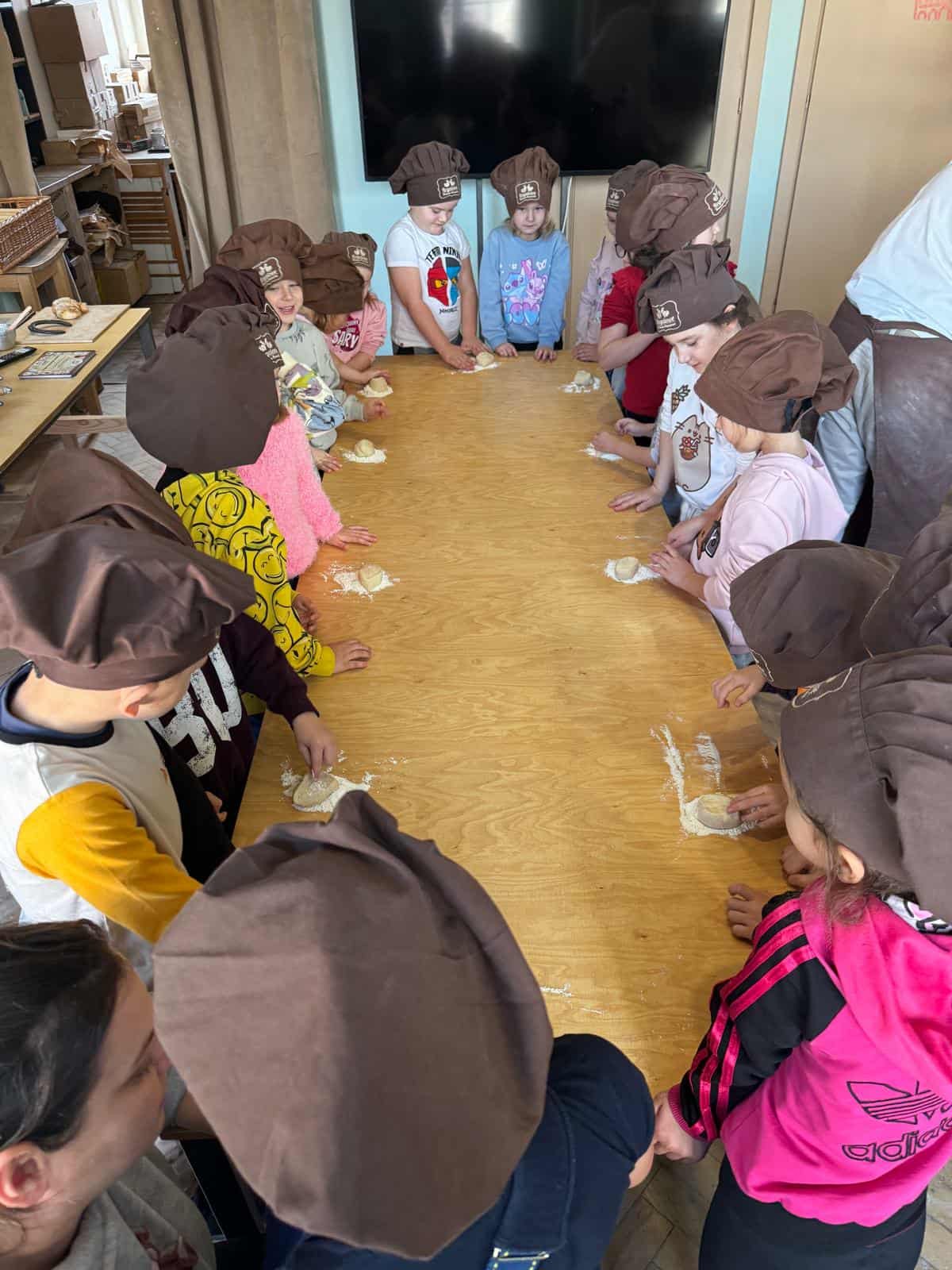 Dzieci w czapkach kuchennych przygotowują ciasto na podłodze