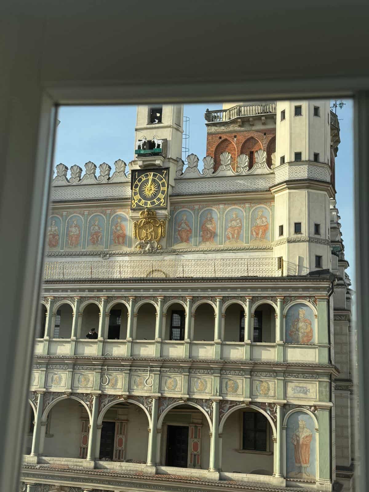 Widok na ratusz z okna, z zegarem i freskami na fasadzie